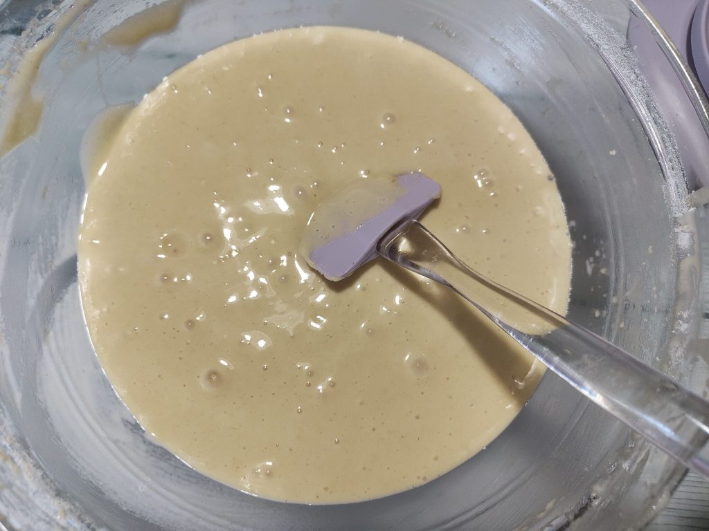 Debes obtener una mezcla clara y espumosa con un volumen doble al inicial.