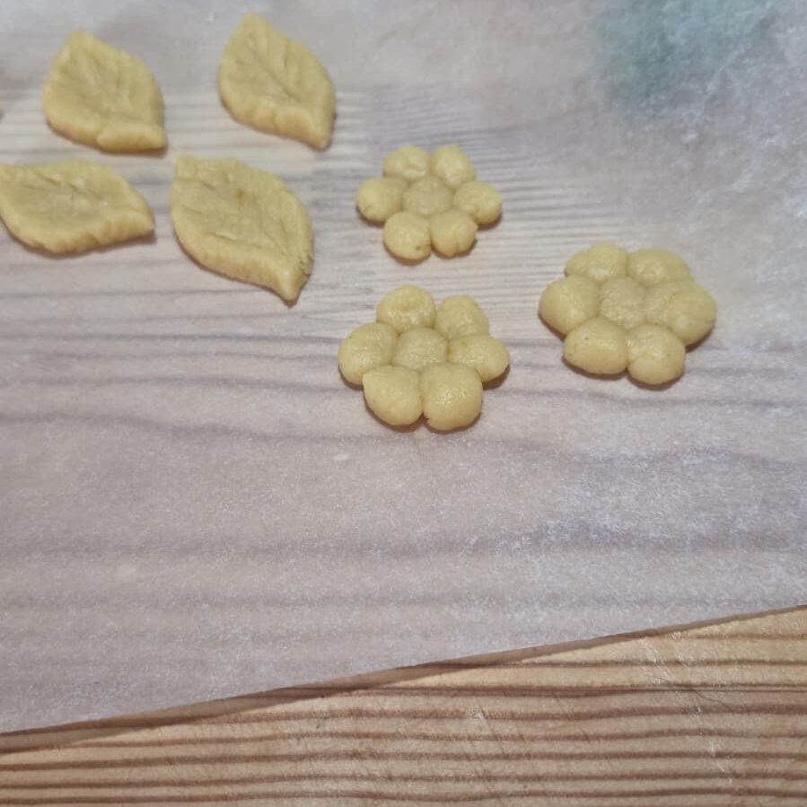 Flores y hojas hechas con los recortes de masa con eritritol
