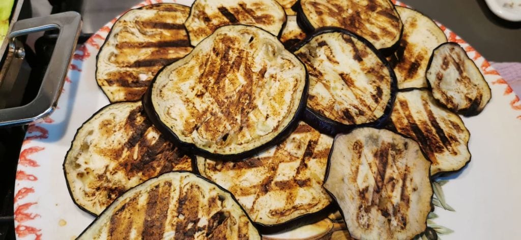 Primero los pimientos que cocinarán aproximadamente 5 minutos por lado, luego las berenjenas y los calabacines que estarán listos después de haber cocido un par de minutos por lado.