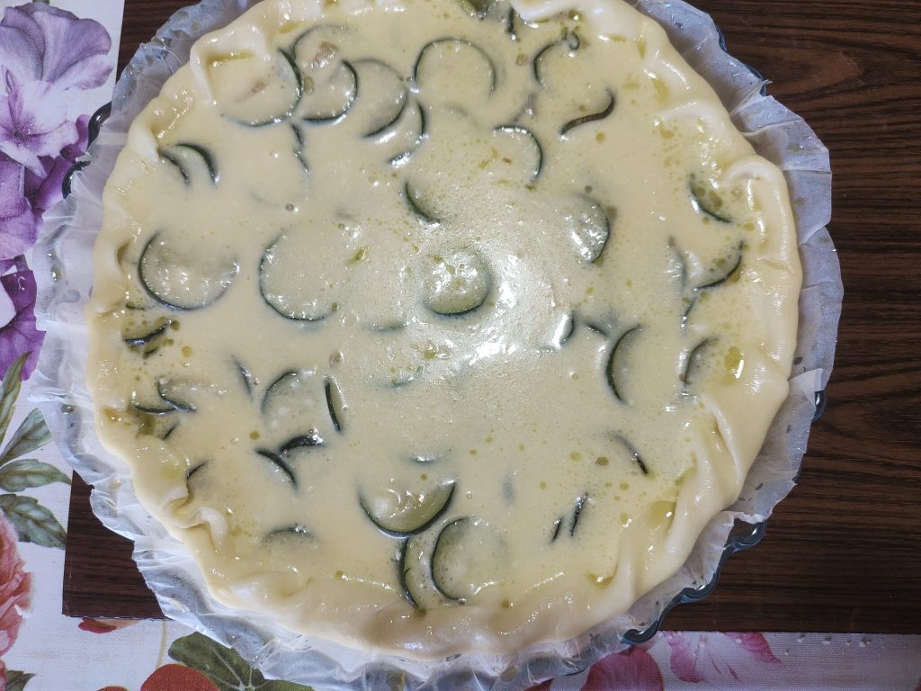 Apenas los calabacines estén cocidos y fríos, distribuidlos por encima, verted encima la mezcla de huevo y parmigiano y distribuidla por toda la superficie.