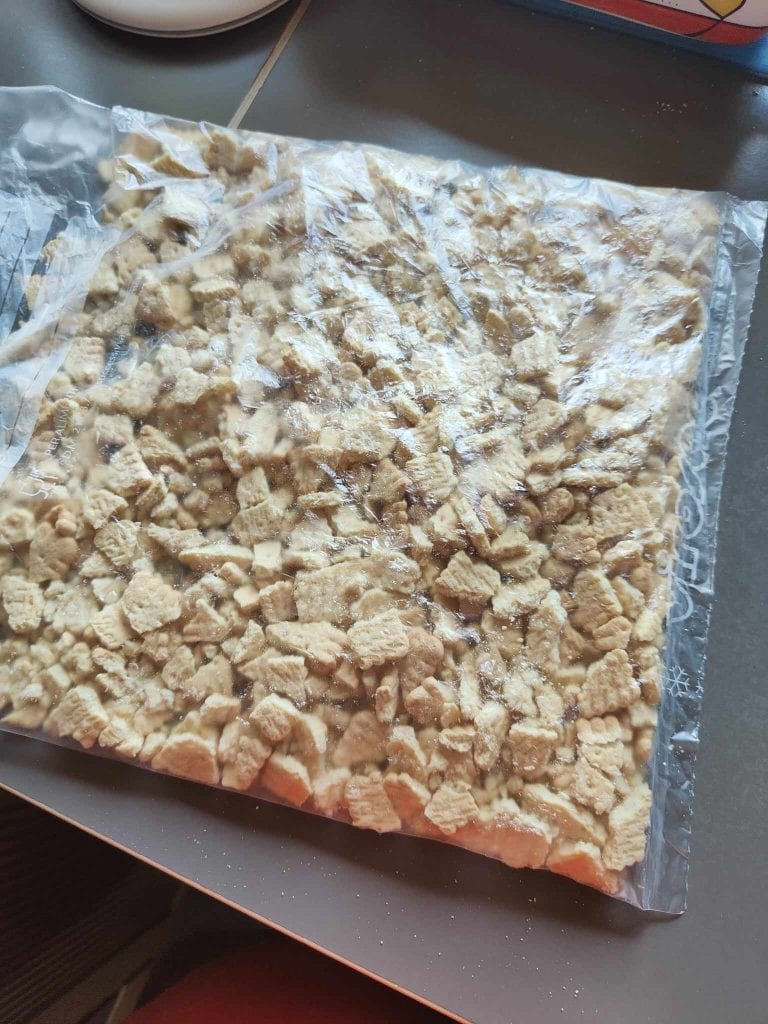 • Coloca las galletas en una bolsa (de las transparentes para congelador) y, aplástalas con las manos o ayudándote con un rodillo, redúcelas a migas gruesas pero no demasiado grandes.