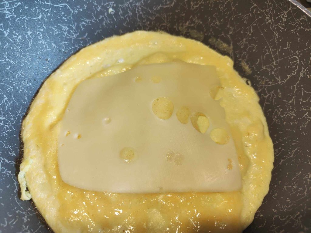 Vierte la mitad de la mezcla de huevos en una sartén ligeramente engrasada con aceite. (Sartén de 22/24 cm).