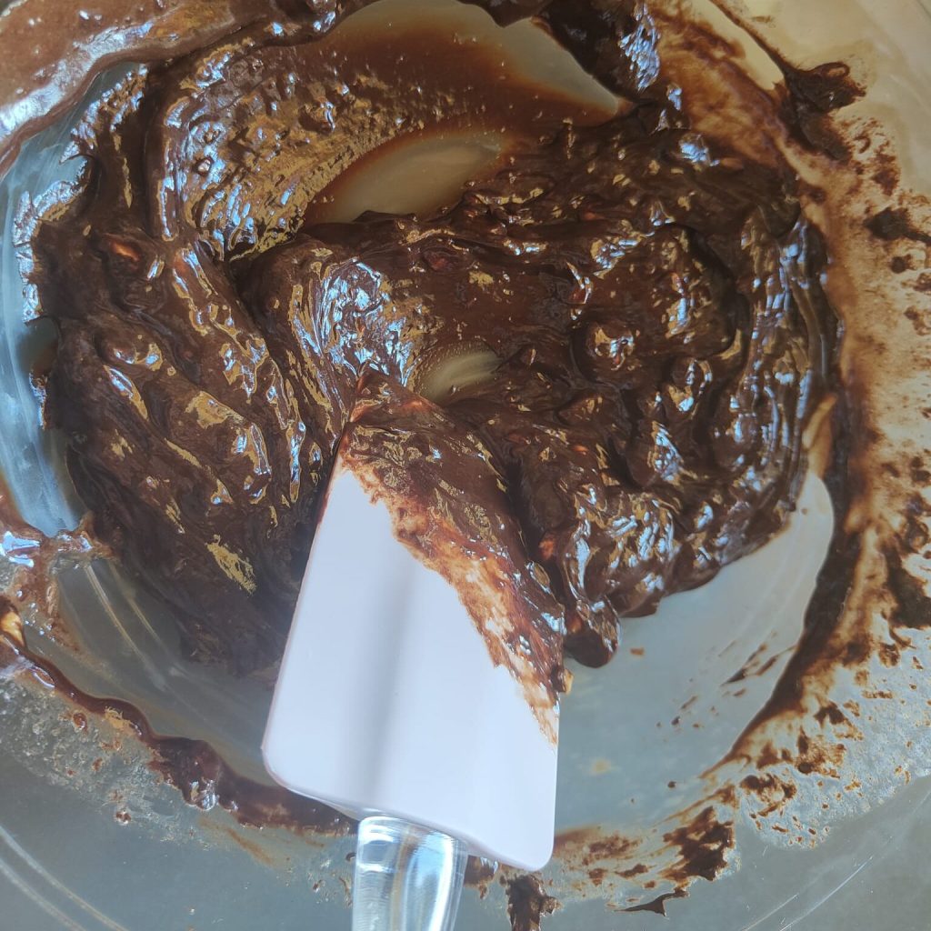 • En un bol bastante grande, mezcla el chocolate fundido, el aceite, el coco rallado, la bebida vegetal y finalmente las galletas desmenuzadas.
