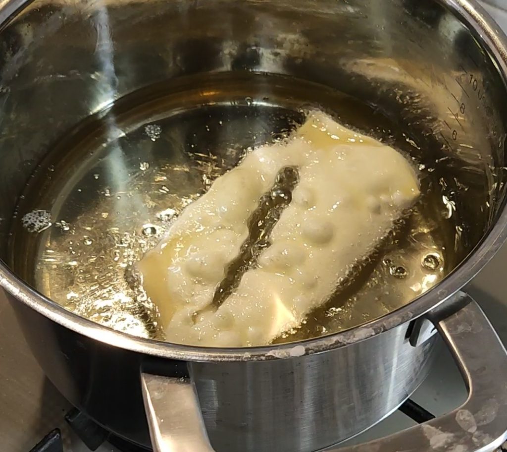 Llevo el aceite de semillas de cacahuete a una temperatura de 170°C y frío estos rectángulos de masa, dándoles la vuelta y los dejo cocinar hasta que estén dorados.