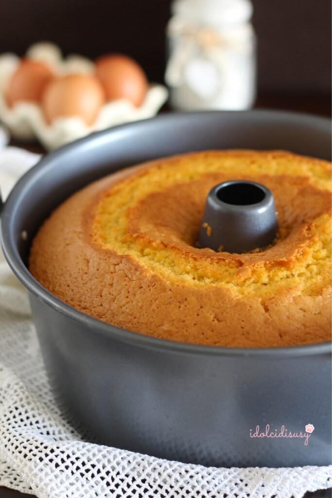 Vierto la masa en el molde para chiffon cake, sin haberlo engrasado, y cocino en horno ya caliente a temperatura de 170° por una hora, me aseguro de la cocción haciendo la prueba del palillo. Una vez cocido, lo desmoldo y lo volteo, apoyándolo en un plato y lo dejo enfriar completamente antes de extraerlo del molde, tomará aproximadamente 2/3 horas. Una vez frío, si es necesario, utilizo un cuchillo con la hoja fina para despegarlo de los bordes y del fondo removible.