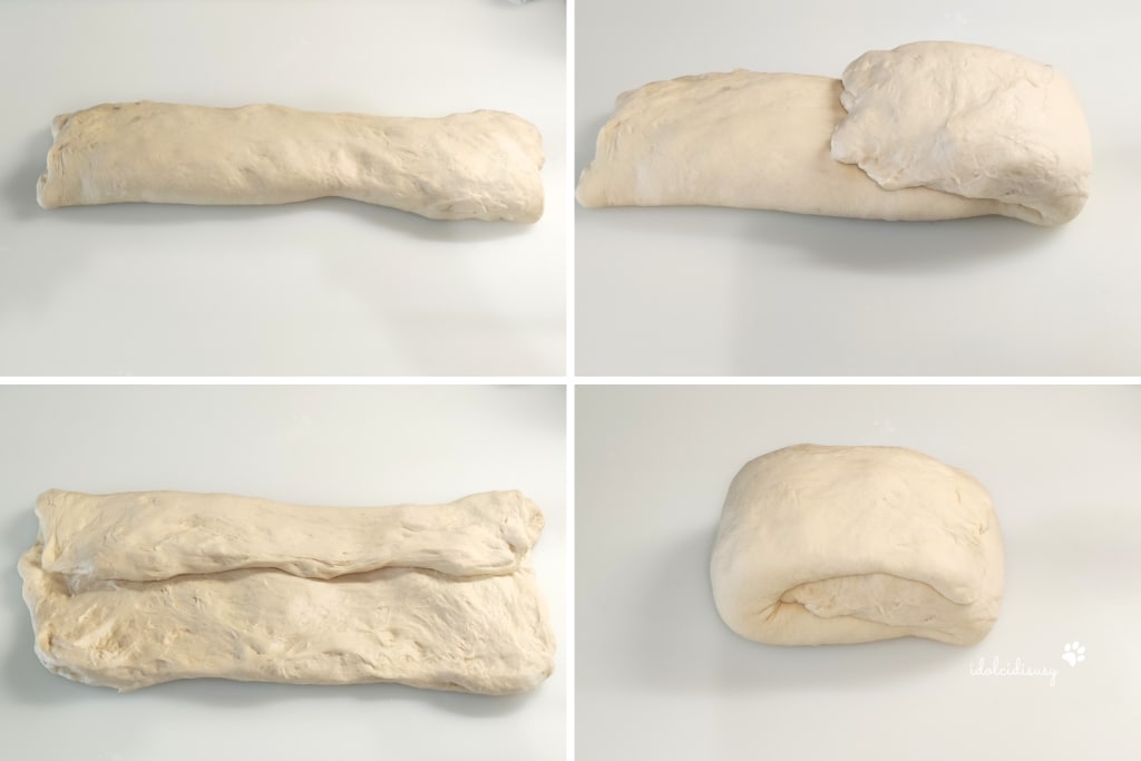 • Extiendo la masa con las manos, llevo el lado superior al centro y con el inferior cierro como un libro, doblo el lado derecho hacia el centro y cierro con el otro como un libro. Repito los pliegues en tres veces dejando reposar la masa al menos 20 minutos entre un pliegue y otro.