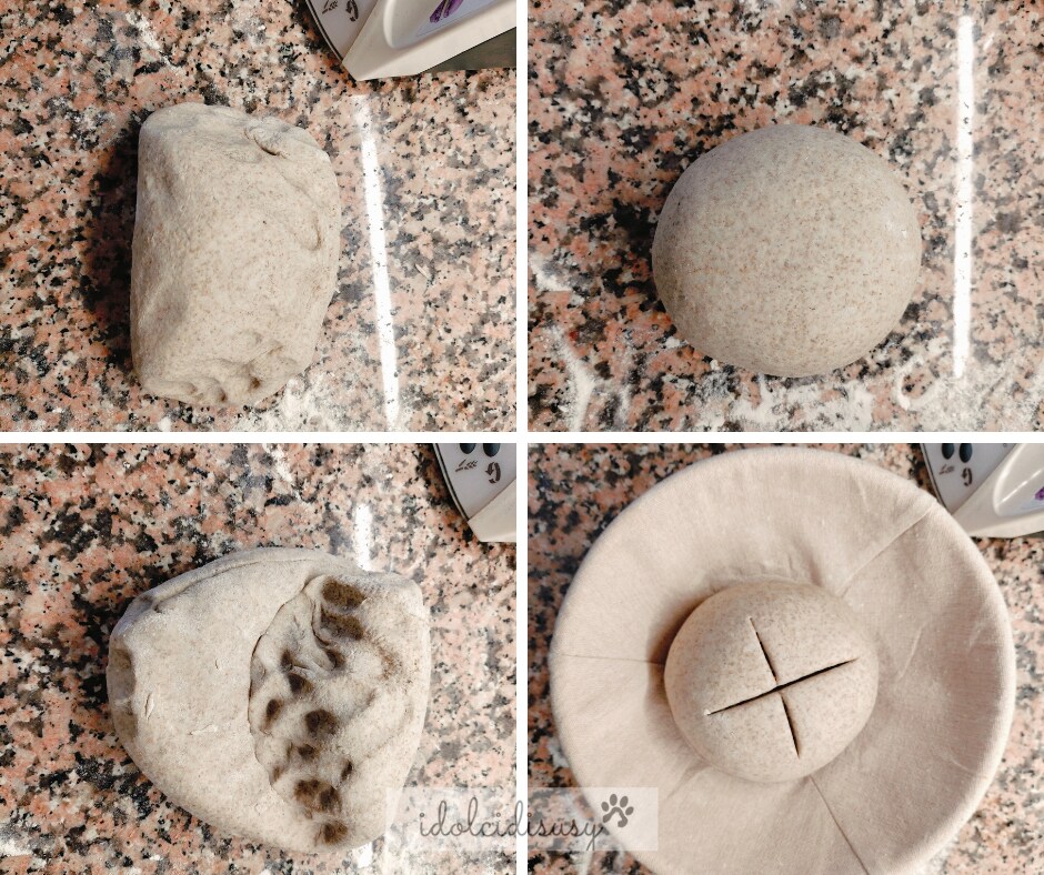Extiendo con las manos la masa dándole forma de rectángulo, imagino dividirlo en 3 partes iguales, superpongo la parte derecha hacia el centro y luego la parte izquierda. Obtengo un rectángulo más estrecho, lo extiendo siempre con las manos y repito el mismo procedimiento, llevo el lado inferior hacia el centro y cierro con el de arriba, giro la masa, la boleo y formo la clásica bola lisa y homogénea. Pongo la masa a fermentar (tomará al menos 8 horas), a temperatura ambiente en el bol o en un cestillo para la fermentación del pan, marco la superficie con un cuchillo y lo cubro con un paño.
