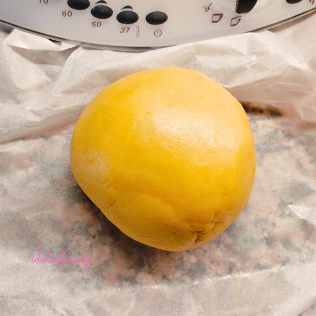 Saco la masa obtenida y la pongo sobre la superficie de trabajo, la trabajo rápidamente para compactarla dándole la clásica forma de bola. La pasta frolla al Bimby está lista, la envuelvo en papel de horno o en film transparente y la pongo en el frigorífico al menos un par de horas antes de usarla.