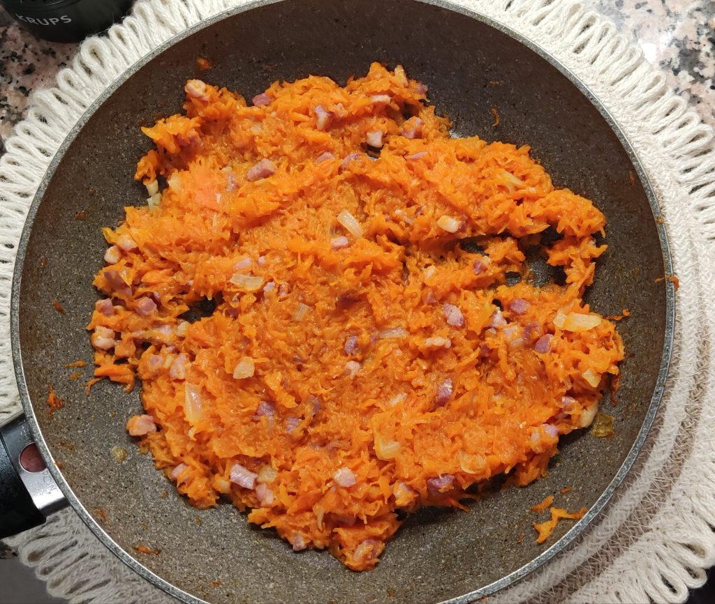 Corto la calabaza en rodajas, la pelo y la corto en trocitos. La pongo en la sartén con media cebolla cortada en trocitos, dos cucharadas de aceite de oliva virgen extra y una pizca de sal. La dejo sofreír a fuego moderado, mezclando y añadiendo 3/4 cucharadas de agua caliente. Mientras tanto, en otra sartén, sofrío la panceta teniendo cuidado de no quemarla.