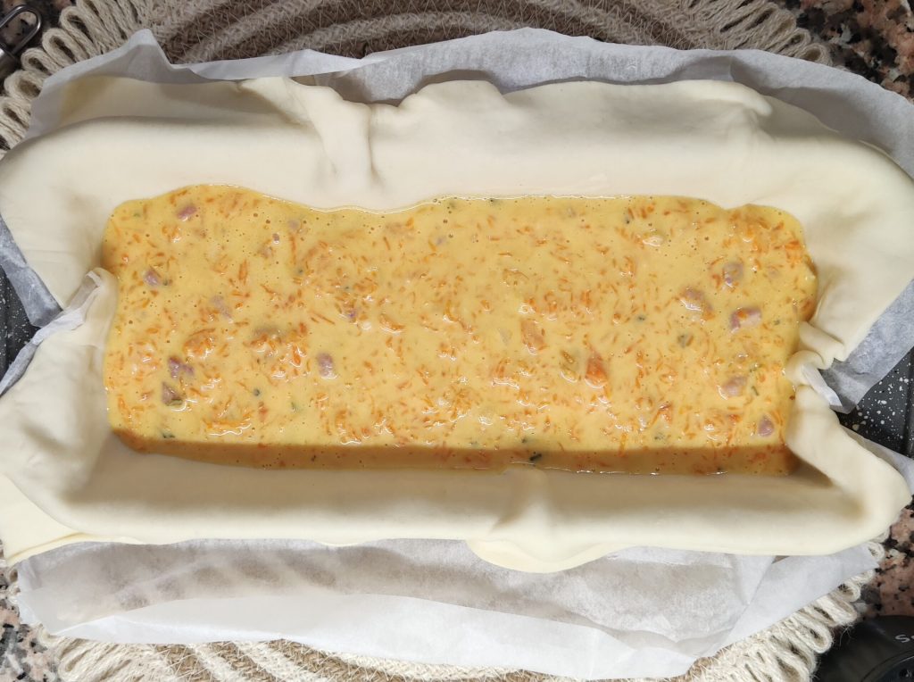 Abro la masa de hojaldre y la pongo en el molde para plumcake, vierto la mezcla dentro, cierro con los bordes de la masa y horneo en modo estático a 180° por 30 minutos.