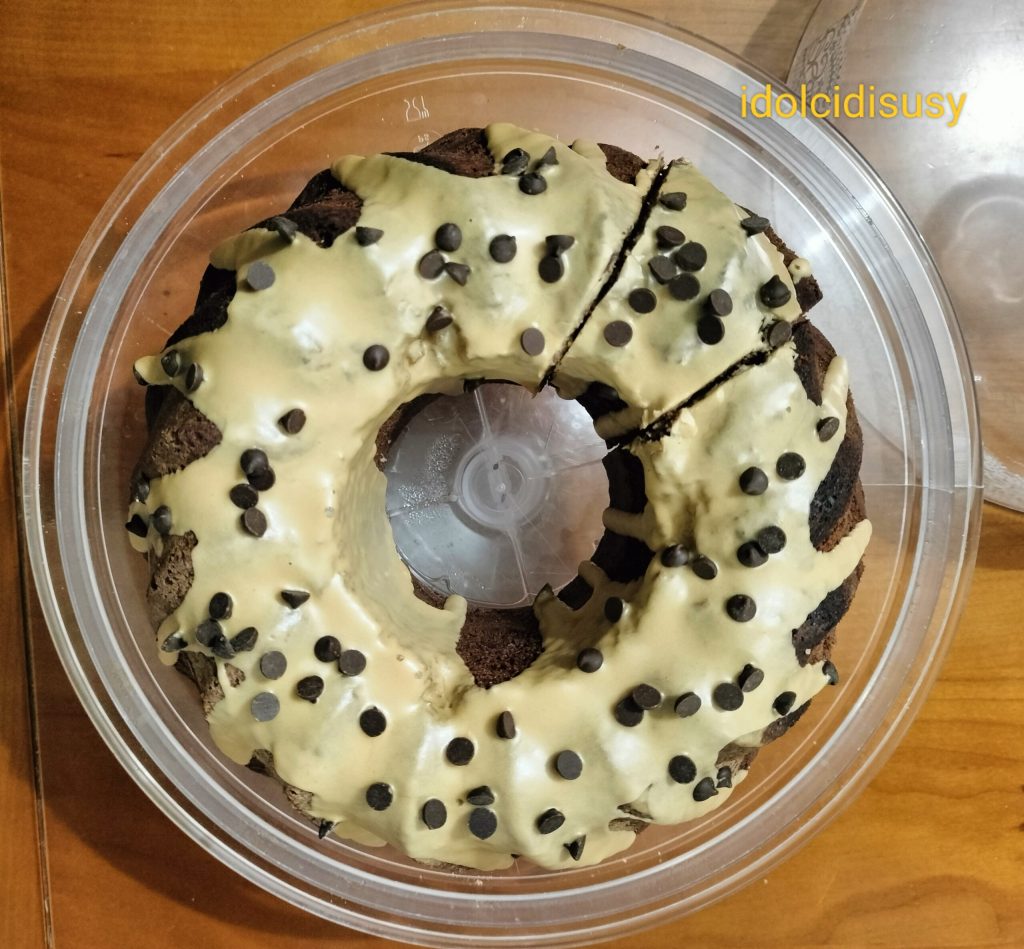 Coloco la rosca en una rejilla y vierto el glaseado sobre la superficie, decoro con chispas de chocolate o mejor aún con granos de café (opcional). Nuestra rosca de café está lista para ser servida.