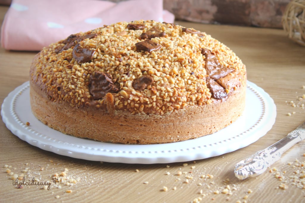 Vierto en un molde de 22 cm previamente enmantecado y enharinado, espolvoreo la superficie con la granela de avellanas y algunos trozos de chocolate, horneo en horno ya caliente a 180° durante unos 35 minutos.