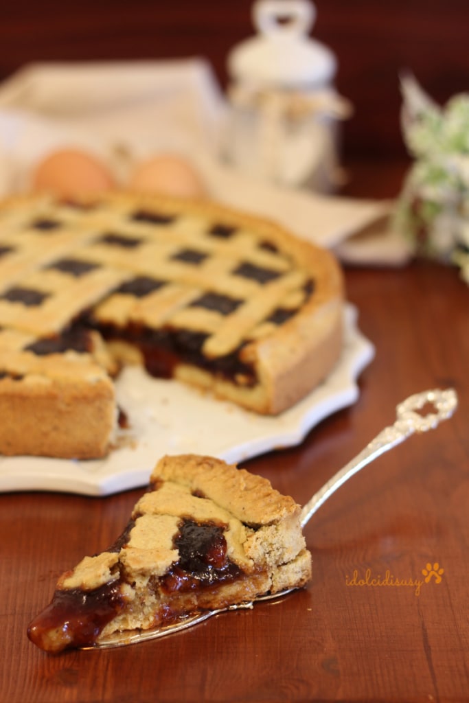 Con los dientes de un tenedor pincho la superficie, vierto la mermelada, con la masa restante corto las tiras para la decoración clásica y horneo a 180° durante 35/40.