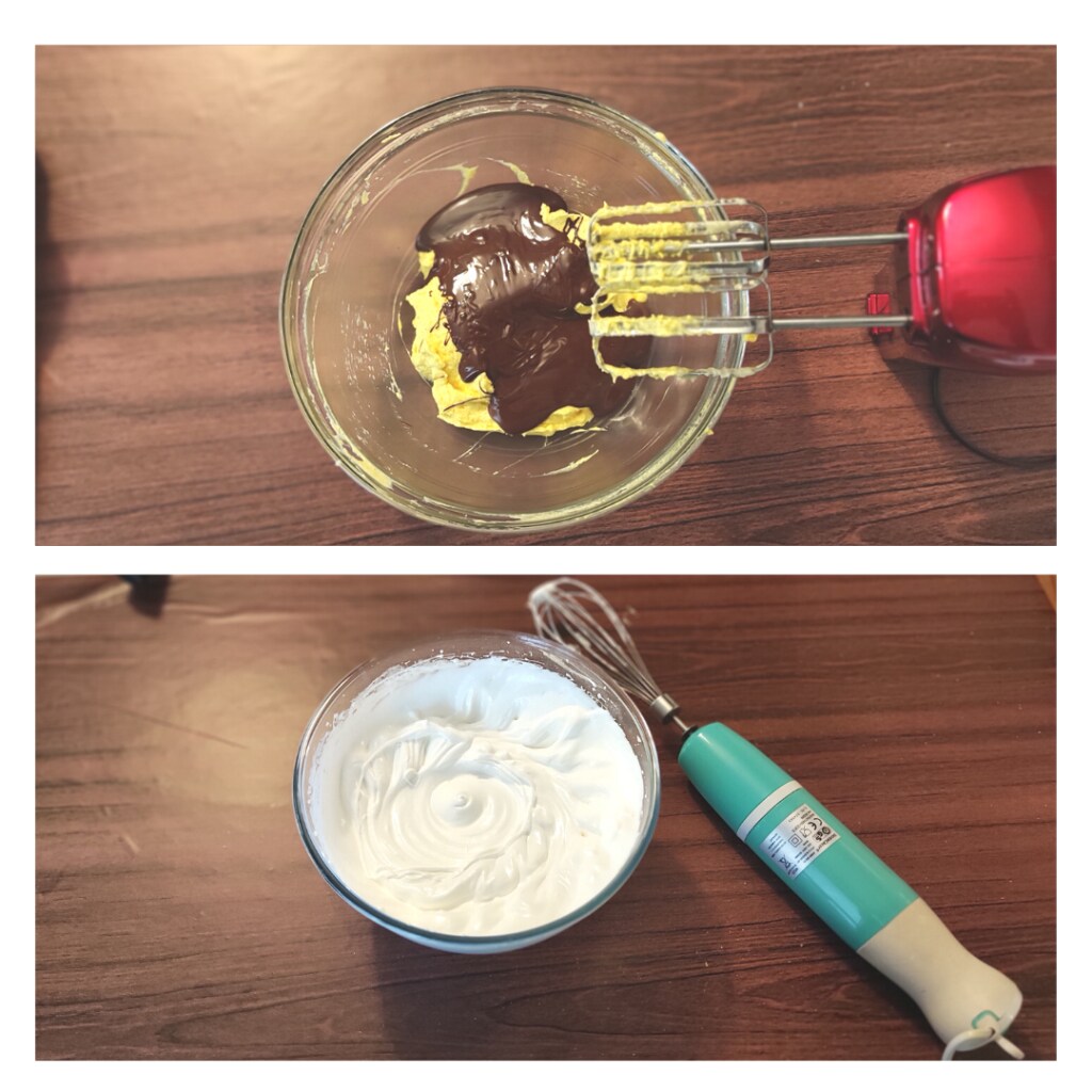 Posteriormente a la mezcla de mantequilla añado las yemas y el chocolate negro ya enfriado. Monto a punto de nieve las claras con el azúcar y las añado a mano muy delicadamente a la masa.