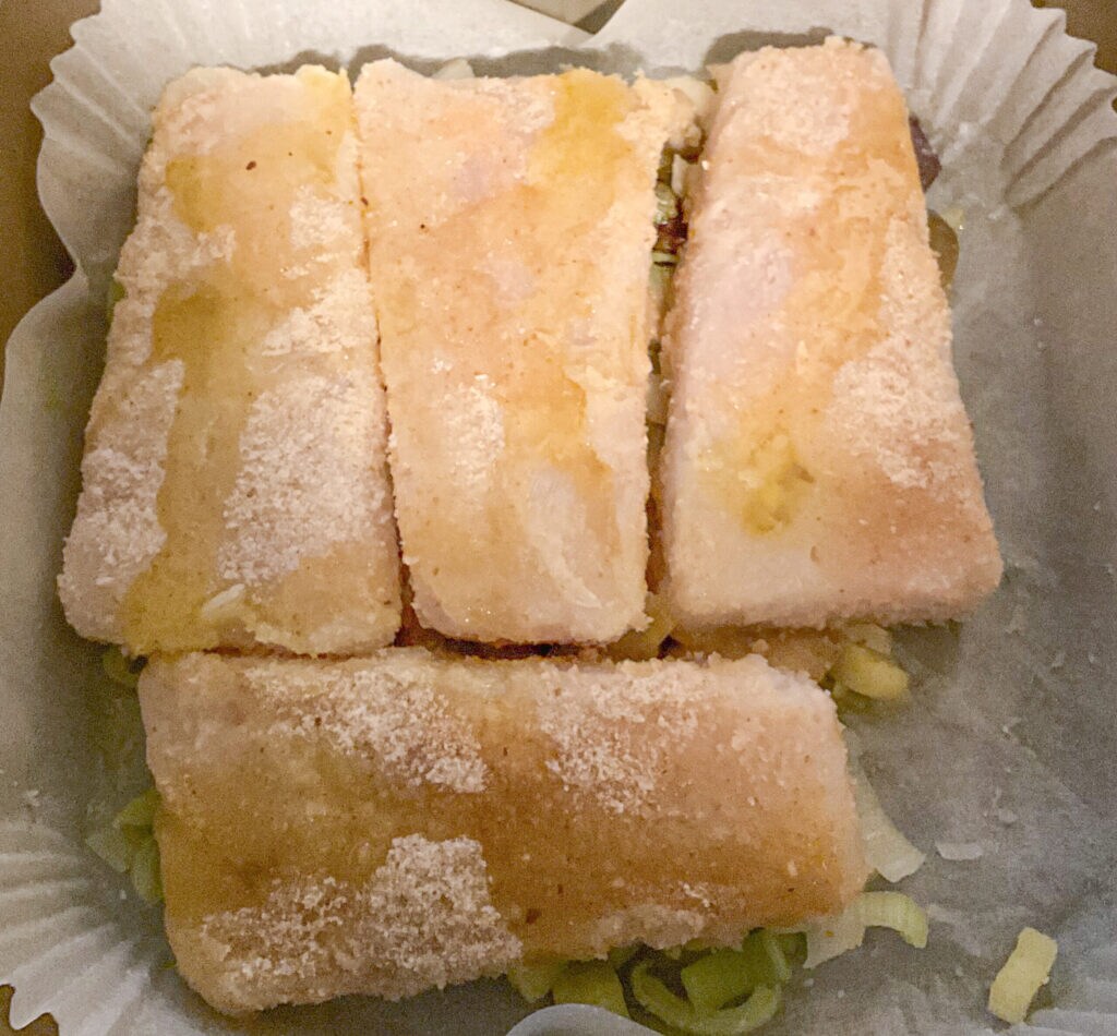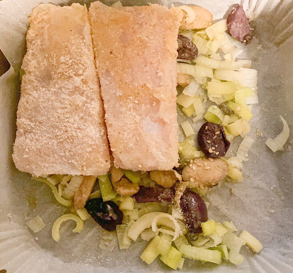 Cubre completamente los puerros, aceitunas y alcaparras con los filetes de bacalao empanados, esto los protegerá de quemarse. Unta con aceite de oliva virgen extra el pescado, sala ligeramente y ponlo en la freidora.