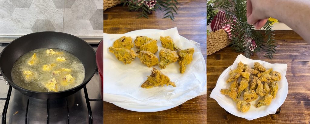 luego sumergidlos en aceite caliente. Coced los corazones durante 6-7 minutos o hasta que estén bien dorados y muy crujientes. Sacadlos con una espumadera y colocadlos sobre papel de cocina, salad al gusto y servid.