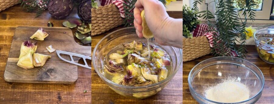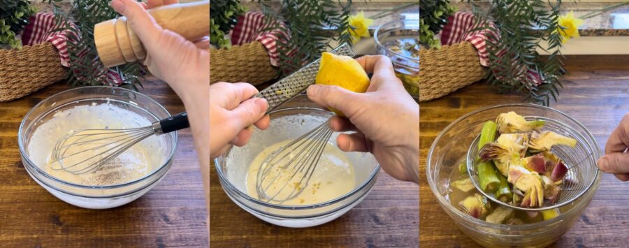 pimienta y ralladura de limón. Recoged los corazones de alcachofa, escurridlos bien y mezcladlos con el rebozado.