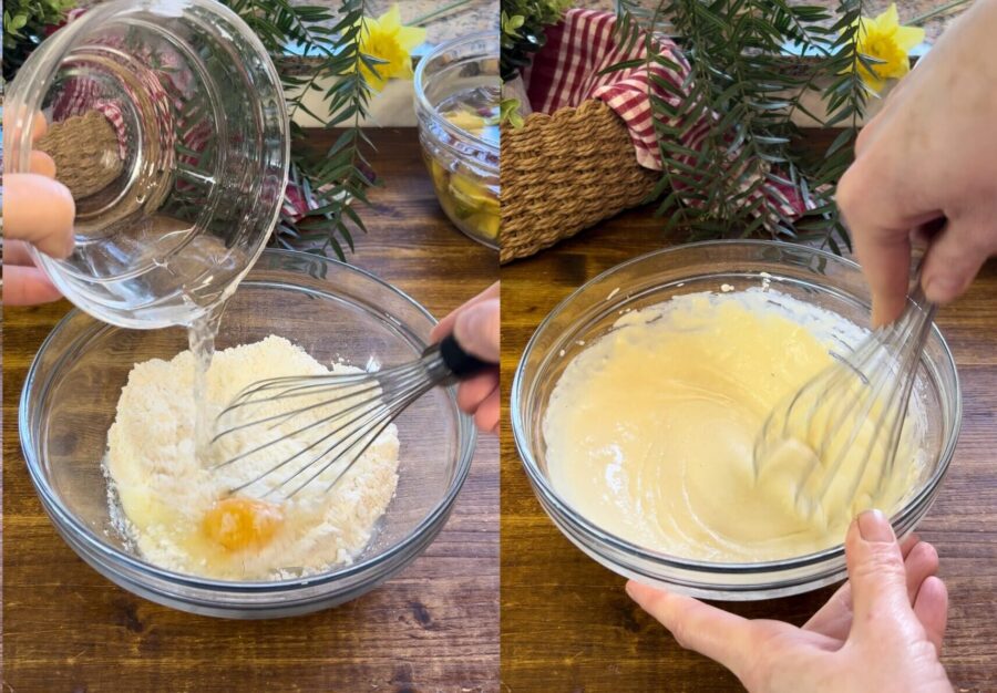 el huevo y el agua, mezclando con las varillas para evitar grumos. Terminad el rebozado con una pizca de sal,