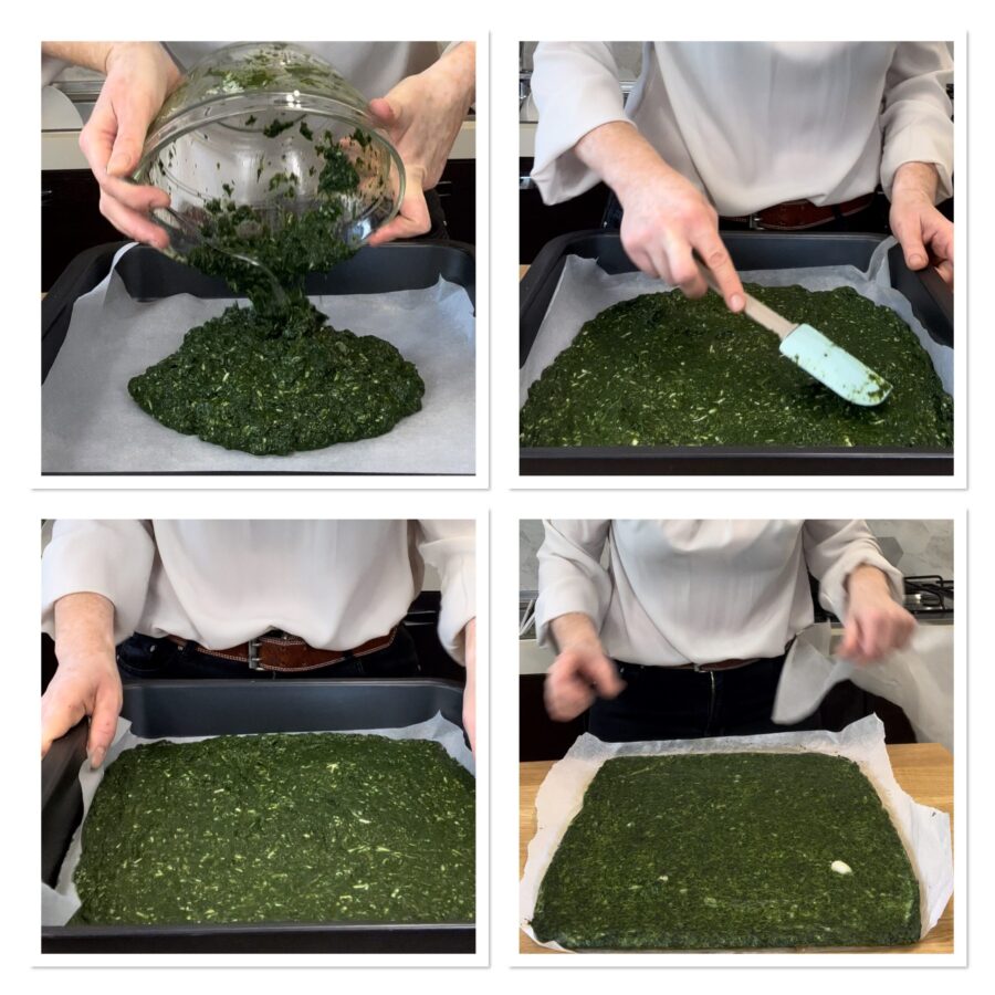 Verted la mezcla sobre una bandeja amplia forrada con papel de horno; yo usé una de 40×40, pero podríais usar también una rectangular de tamaño similar. Coced a 200°C en horno estático precalentado durante 8 minutos, luego tocadla en el centro y si se mantiene firme, sacadla; si no, continuad la cocción uno o dos minutos más o lo que haga falta.