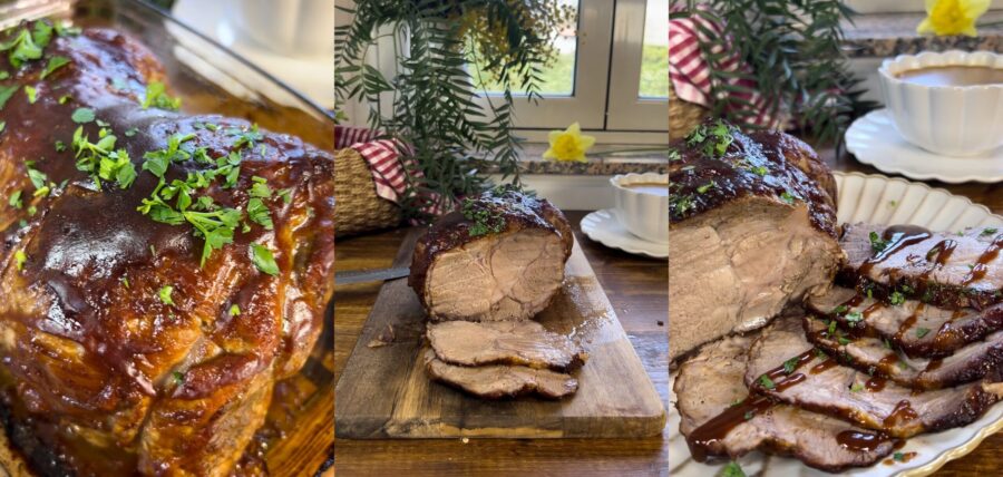 Asado de cerdo glaseado con salsa barbacoa, un asado sencillo que queda súper tierno y se prepara sin estrés, tal y como la lonza de cerdo asada con manzanas o la coppa de cerdo al vino blanco. ¿Os acordáis cuando cocinamos los muslos de pollo con salsa barbacoa al horno y las alitas de pollo con salsa barbacoa hechas en sartén? Ahora damos un salto de calidad y nos dedicamos a un sabroso asado, cocinado solo con cebolla y salsa barbacoa: solo dos ingredientes para un segundo espectacular. Para hacer el asado cocinado con salsa barbacoa necesitarás un corte de carne que tenga hilos de grasa en su interior; yo he elegido la coppa de cerdo que siempre queda jugosa, incluso si la cocinas un poco más y no hace falta medir la temperatura en el centro. Por lo demás solo tendrás que cocinarla en la olla y luego terminar en el horno para un glaseado perfecto con salsa barbacoa. Vamos a la cocina, estoy segura de que os encantará este segundo «americano», al menos en sabor: sencillo y delicioso. Antes de ir a la cocina, como siempre os recuerdo que si queréis estar al día con todas mis recetas, podéis seguir mi página de Facebook (aquí) y mi perfil de Instagram (aquí).