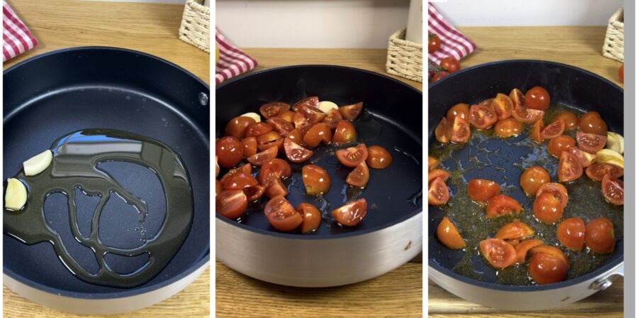 Calienta el aceite con un diente de ajo entero partido por la mitad. Añade los tomates cherry y sala; deja que se ablanden y añade el bacalao escurrido de los restos de agua y secado con papel de cocina.