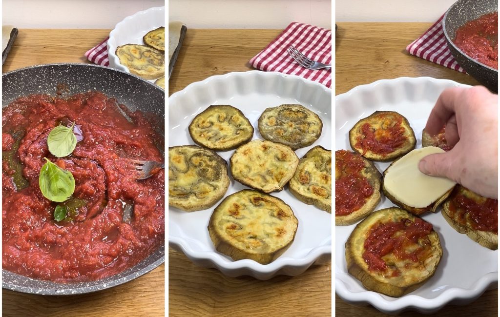 • Coced la salsa de tomate hasta que espese y rectificad de sal, aceite y albahaca. Colocad las primeras rodajas en una fuente, sobre cada rodaja repartid un poco de salsa de tomate.