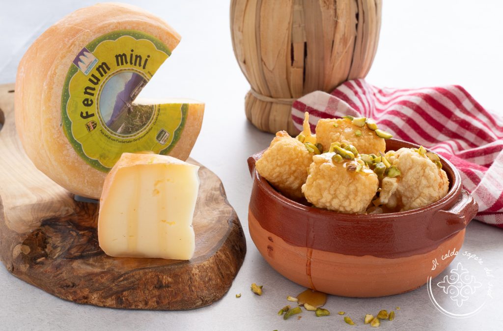 Bocaditos de queso dorados con miel. Bocaditos de queso rebozados en masa, dorados y con un delicioso acabado de miel y pistachos. Imagínate que tienes que improvisar un aperitivo un entrante y no sabes qué llevar a la mesa: ¡tranquilo, ahora te ayudo yo! Hace unos días una llamada inesperada me avisó de que vendrían a vernos unos amigos al caer la tarde y así que decidí ponerme a cocinar para preparar un aperitivo original y apetecible de última hora. Además de los habituales picoteos, patatas fritas y demás, también pensé en preparar unos bocaditos de queso rebozados y fritos con el queso Fenum mini de «La latteria Tre Cime». Un queso delicado y aromático que, como indica su nombre, se elabora con leche de heno. El Fenum mini tiene una pasta blanda, por eso para rebozarlo y freírlo seguí unos pequeños trucos que os explicaré en la receta y, una vez dorados mis bocaditos, los serví con un chorrito de miel y un poco de granillo de pistacho. En la práctica, con pocos ingredientes hice un finger food para aperitivo sencillo y delicioso y además un poquito chic. ¿Queréis probar la receta? ¡Vamos a la cocina, nuestros bocaditos de queso nos esperan!