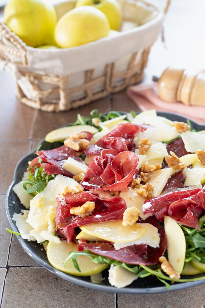Bresaola, rúcula, manzana y nueces. Las ensaladas veraniegas sabrosas o simplemente las ensaladas en general son mi pasión y las que más me gustan son las ensaladas con fruta fresca y fruta seca, exactamente como esta ensalada con rúcula, manzana, nueces, bresaola y Grana Padano. Una ensalada que, si se acompaña con unos crostini de pan aromatizados al horno o con el simple pan casero, se convierte en un plato único sano y ligero, ¡realmente sabroso! Vamos a la cocina, os explico mi receta en un momento, pero antes os recuerdo que si queréis estar al día con mis recetas, podéis seguir mi página de Facebook (aquí) y mi perfil de Instagram (aquí).