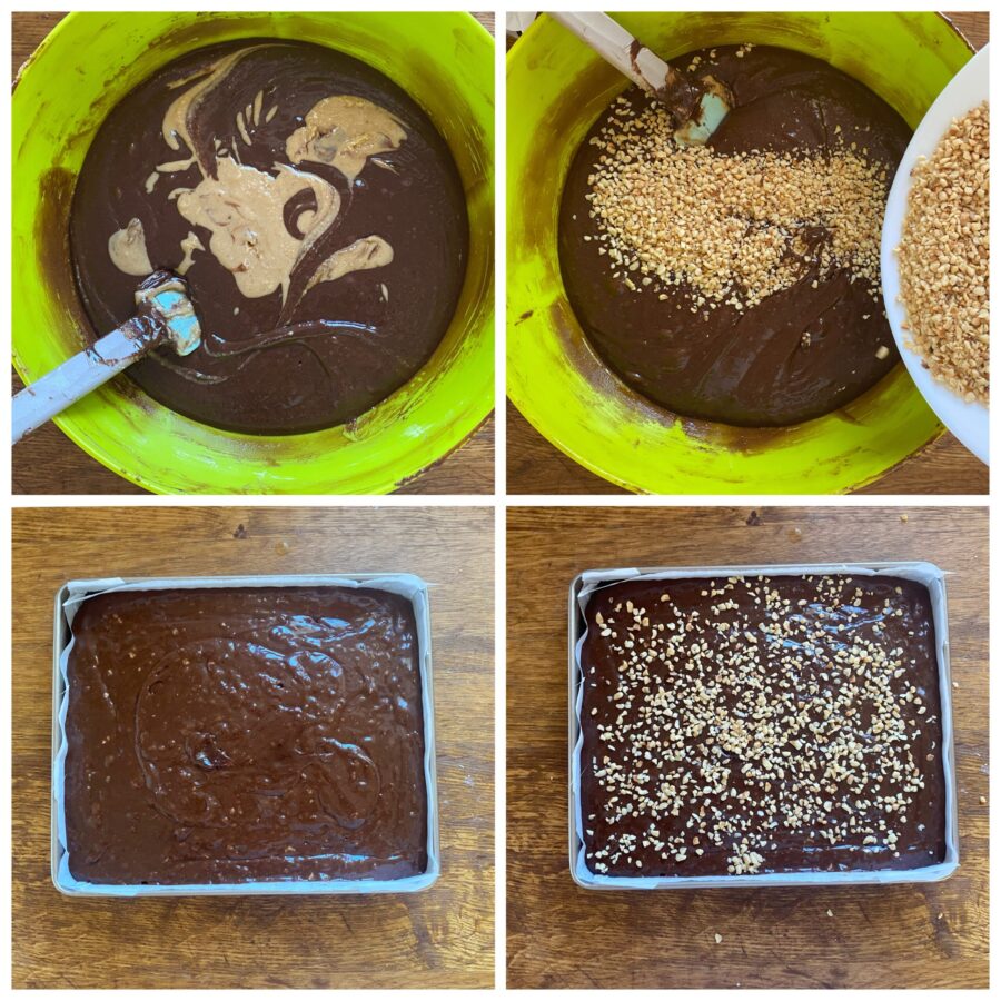 Mezclad y verted la masa en un molde pequeño cuadrado o rectangular forrado con papel de horno; el nuestro medía aproximadamente 20×25 cm.