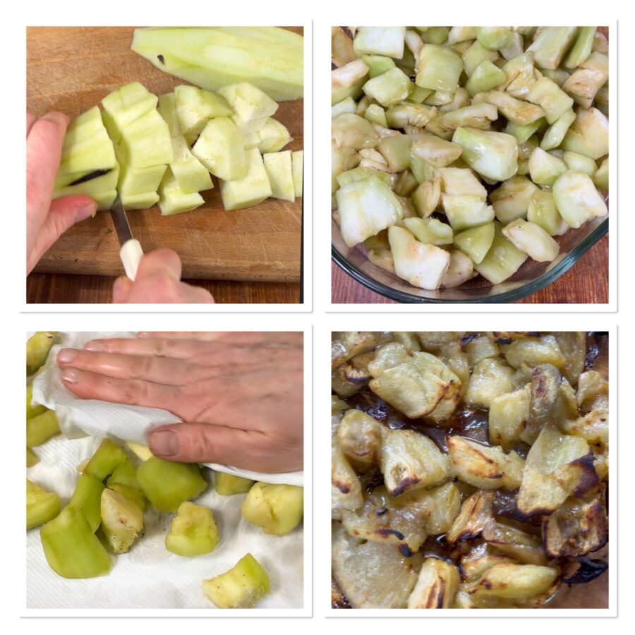 Pela las berenjenas, córtalas en cubos, colócalas en un bol, espolvorea con un poco de sal, mezcla y deja reposar 30 minutos. Transcurrido ese tiempo, vuelca los cubos de berenjena sobre papel de cocina y sécalos con toques para eliminar muy bien el agua de vegetación. Dispón las berenjenas en una bandeja, rocía con un buen chorro de aceite y hornea en horno precalentado a 200°C, con ventilación, hasta que estén tiernas y doradas. Pueden bastar 20 minutos.