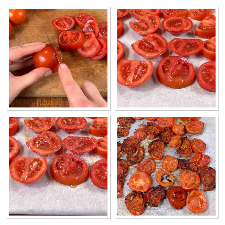 Corta los tomatitos, colócalos en una bandeja forrada con papel de horno, riega con un chorrito de aceite, espolvorea con sal, una pizca de azúcar y orégano seco y hornea a 200°C (ventilado) durante 15-20 minutos.