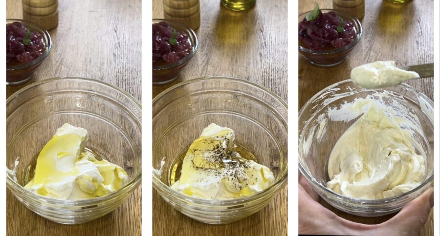 En un cuenco mezcla el queso de cabra o el untable que hayas elegido con aceite, pimienta y miel; si hace falta, ajusta de sal.