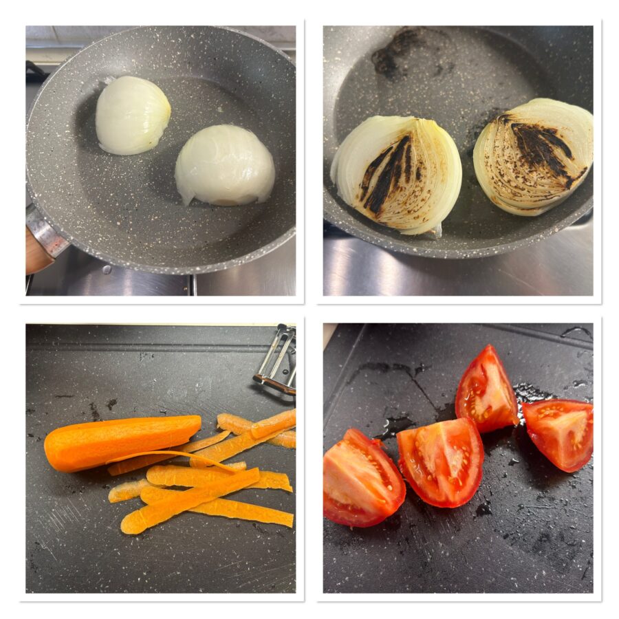 • Para hacer el caldo de verduras, pela la cebolla, colócala en una sartén antiadherente y déjala dorar (brasear), sin añadir aceite ni mantequilla, durante 4-5 minutos a fuego vivo. Pela las zanahorias y córtalas en trozos grandes, divide los tomates en 4 partes, quita las hojas del tallo del apio y córtalo en dos o tres trozos.