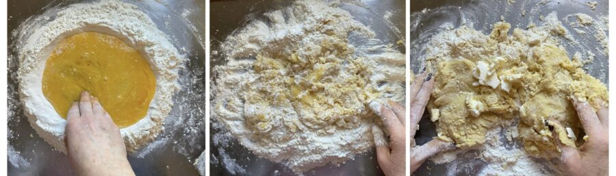 Empezad a integrar la masa, cuya consistencia resultará bastante blanda, pegajosa y difícil de trabajar.