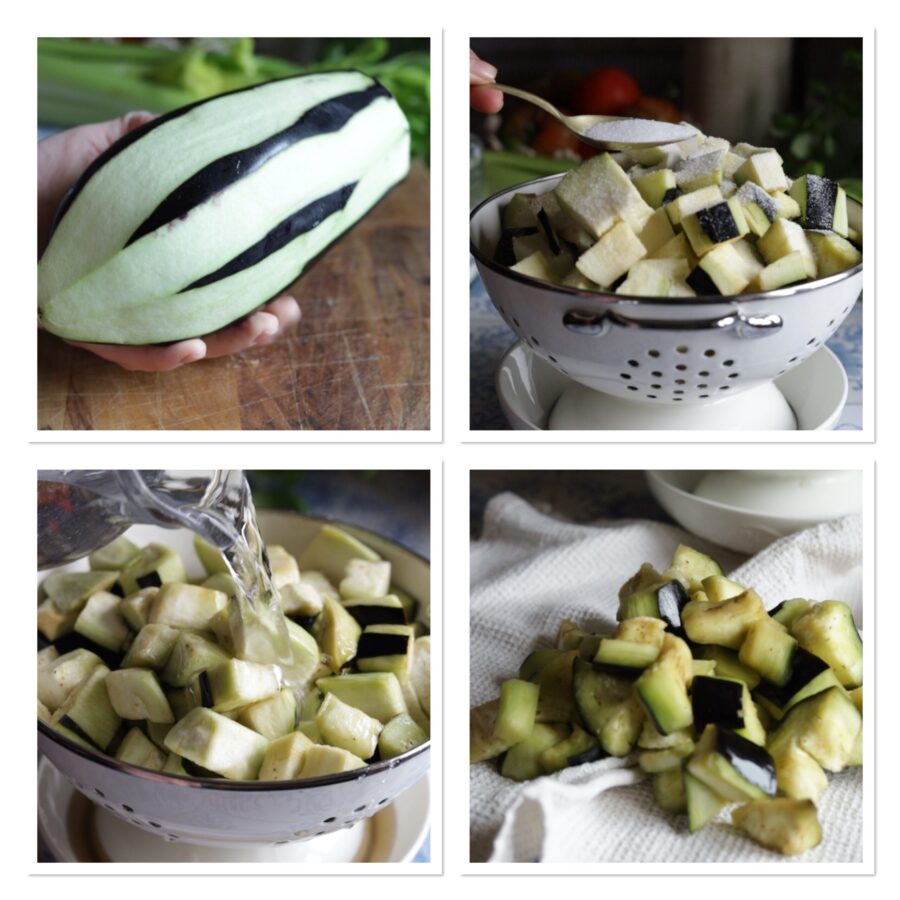 Pela las berenjenas, pero no por completo: deja algunas franjas de piel, aportarán sabor y evitarán que la caponata se oscurezca demasiado. Córtalas en trozos, colócalas en un colador, espolvorea un par de cucharadas de sal y espera a que suelten parte de su agua de vegetación. Pasados unos treinta minutos, enjuágalas abundantemente con agua limpia o bajo el grifo para eliminar el exceso de sal. Escúrrelas con las manos y sécalas bien con un paño.