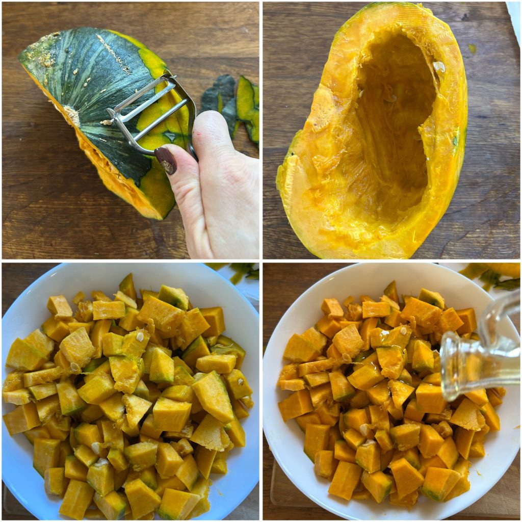 Para hacer la caponata invernal, empezad pelando la calabaza, retirando las semillas y las hebras, y cortadla en cubos. Reunid los cubos de calabaza en un bol y aliñad con un buen chorro de aceite,