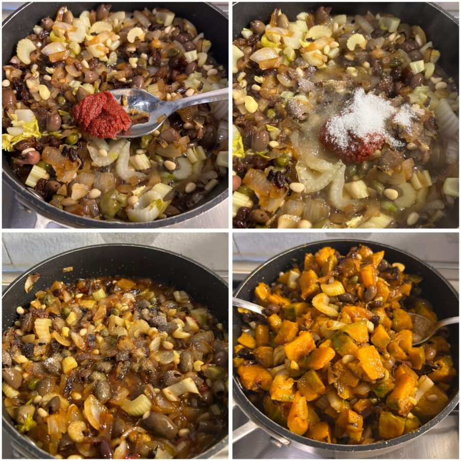 Cortad el apio y blanqueadlo un minuto en una solución de agua y vinagre (un vaso de agua y 30 ml de vinagre). Unid el apio bien escurrido a la cebolla pochada, añadid el concentrado de tomate, el vinagre restante, el azúcar, sal al gusto, alcaparras desaladas, aceitunas, piñones (mejor si se tuestan ligeramente en la sartén) y pasas; mezclad todo y poned la mezcla al fuego vivo.