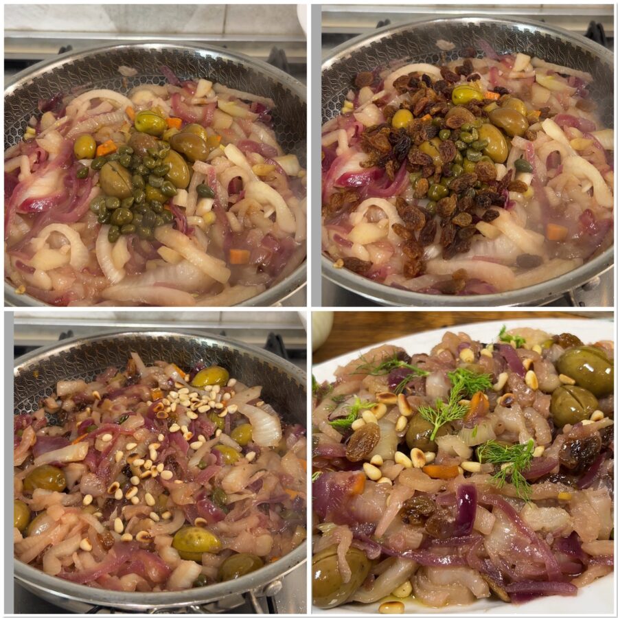 Cuando los hinojos vuelvan a chisporrotear porque se ha evaporado todo el vinagre, añadid las aceitunas (yo usé las mías ya aliñadas, con apio y zanahorias, pero valen casi todas e incluso las simples en salmuera), las alcaparras, las pasas y los piñones que previamente habréis tostado en la sartén. Cocinad unos minutos más a fuego vivo, reduciendo con más vinagre si hace falta y ajustando de sal.