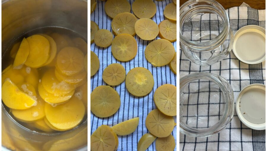 Para empezar, reunid los tarros y las tapas en una olla llena de agua, llevad a ebullición y esterilizad durante 5 minutos; luego sacadlos con pinzas y dejadlos secar sobre un paño limpio con la boca hacia abajo. A continuación, juntad la sal, el vinagre y el vino en una olla y llevad a ebullición. Enjuagad los caquis, retiradles el pedúnculo y cortadlos en rodajas de medio centímetro.