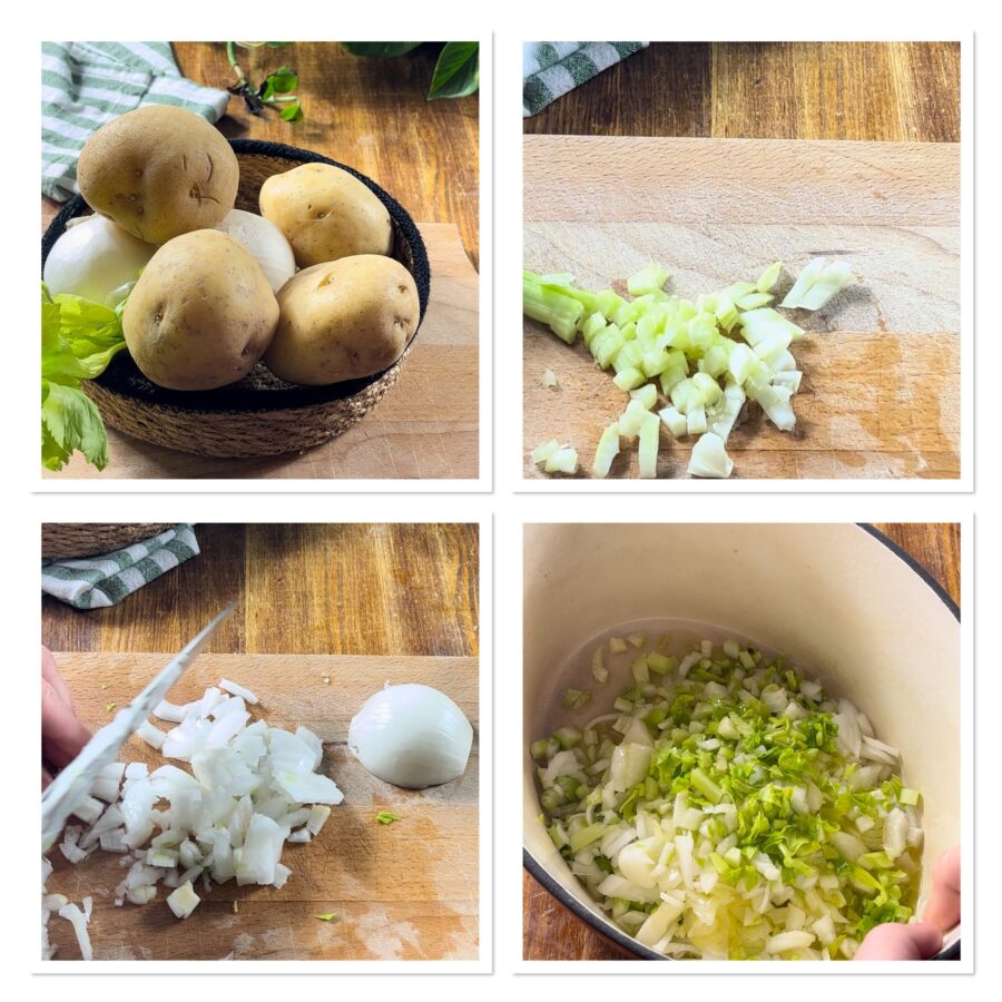 Preparad todos los ingredientes. Lavad el apio y picadlo junto con las hojas más tiernas. Pelad, lavad y picad dos buenas cebollas grandes, poned todo en una olla de fondo grueso, echad un buen chorro de aceite y dejad que se poche.