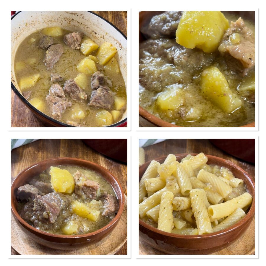 Carne a grassato a la catanesa, la receta del estofado con patatas a la siciliana y una receta de la cocina siciliana y de las recetas de la abuela muy querida, como el Falsomagro al sugo o el Sugo di carnevale alla catanese. La carne aggrassato siciliana es una receta de la abuela con un nombre tan extraño como sabroso. El estofado aggrassato con patatas es un plato de la tradición culinaria siciliana y, como suele ocurrir con las recetas típicas, existen innumerables variantes: no solo cada provincia, sino incluso cada pueblo, barrio o familia tiene su versión exclusiva que considera la mejor. Hay quienes, por ejemplo, disfrutan de la carne a grassato con patatas y guisantes y quienes prefieren la carne aggrassato con patatas y salsa, añadiendo entonces concentrado de tomate o passata. Cuando yo era pequeña, la carne a grassato en blanco con patatas era el plato que mi abuela Cettina, la madre de mi madre, preparaba los domingos. Pero ¿qué significa «carne a grassato»? Os lo digo ya: grassato no significa graso, sino glaseado. Y ese glaseado lo da la salsita que se forma al deshacerse un poco las patatas en el caldo de la carne, una especie de crema delicada que envuelve cada bocado de carne, dejándolo tierno, aterciopelado y reconfortante, y que permite también condimentar la pasta, que así se convierte en pasta aggrassato. Porque la carne a grassato en blanco con patatas es un verdadero comfort food, un estofado con patatas que tiene su origen en tiempos en los que la carne era poca y se comía una vez por semana; se cocinaba con patatas para aumentar la cantidad de raciones en la mesa. Y precisamente porque así uno podía llenar la barriga con poco, nació también el dicho «i patati su megghiu da carni» (las patatas son más buenas que la carne). Vamos a la cocina a prepararla juntos, estoy segura de que os gustará; pero antes os recuerdo que, si queréis estar al día con mis recetas, podéis seguir mi página Facebook y mi perfil Instagram.