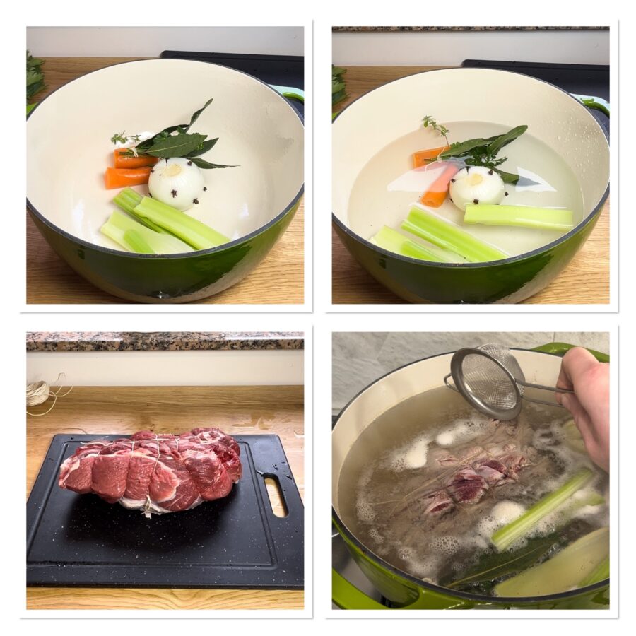 • Para hacer la carne hervida, pelad las zanahorias y cortadlas en trozos grandes; quitad las hojas al tallo de apio y cortadlo en dos o tres partes; pelad la cebolla y clavadle los clavos de olor. Reunid en la olla la zanahoria, la cebolla, el apio, todos los condimentos y las especias, cubrid con agua y poned al fuego. Atad la carne para que no se deshaga durante la cocción y añadidla al resto de ingredientes en la olla (no es necesario que hierva), añadid por ahora solo una pizca de sal. Llevad la olla a ebullición a fuego medio y, mientras tanto, con la ayuda de un colador retirad la espuma que se habrá formado y desechadla; luego bajad el fuego y cocinad a fuego muy lento durante unas 3 horas o un poco más. Casi al final de la cocción, acordaos de rectificar de sal correctamente. Tras este tiempo, la carne debería haber quedado muy tierna y lista para consumirla como prefiráis; yo la desmenuzo simplemente y la hago en ensalada con aceite, sal y vinagre, o la sirvo con un poco de caldo, para comerlo todo con pan. En cuanto al caldo, dejadlo enfriar para que la grasa se solidifique y podáis eliminarla; después solo tendréis que calentarlo un poco si está gelificado y filtrarlo con un colador cubierto con gasa en varias capas: de este modo podréis eliminar las partes más toscas.