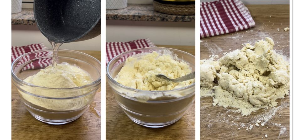 Verted la harina en un cuenco y añadid la agua muy caliente poco a poco, mezclando con una cuchara. Volcad todo sobre la superficie de trabajo y trabajad la masa hasta que sea compacta y homogénea.
