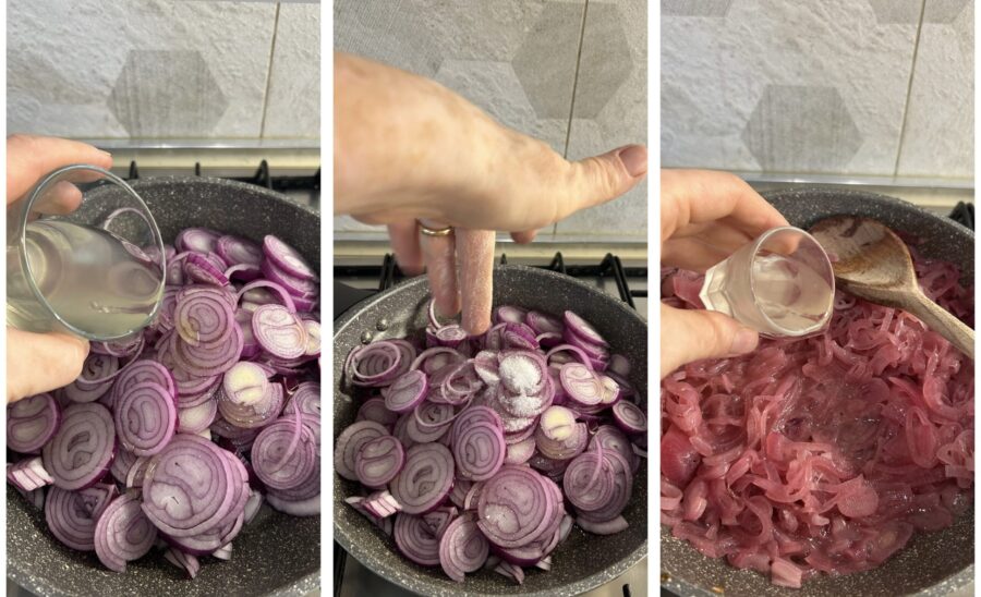 • Para preparar las cebollas de Tropea en agridulce, peladlas y cortadlas en rodajas no demasiado finas. Reunidlas en una sartén muy amplia, dadles un chorro de aceite y regad con un vaso de agua en el que habréis diluido la mitad del vinagre, salad y dejad cocinar a fuego bajo hasta que toda el agua se haya evaporado. Tardarán al menos 45 minutos.