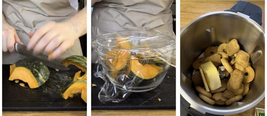 Lava la calabaza, parte de unos 800 g, quítale las semillas, córtala en trozos medianos y colócala en un bol. Cubre con film apto para microondas y cocina en el microondas 20 minutos a 750 W, o cocínala al vapor durante 20 minutos. Como alternativa, envuélvela en papel de horno y luego en papel de aluminio y hornea a 200°C durante 35-40 minutos o hasta que esté muy tierna. Mientras tanto, tritura las galletas con la mantequilla y una pizca de sal,