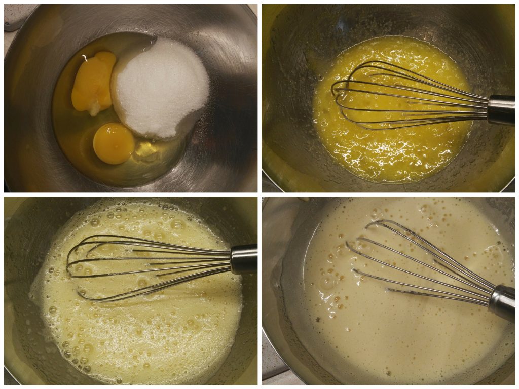 Abrir los huevos y verterlos en un bol junto con el azúcar; poned un poco de agua a hervir en un cazo y colocad el recipiente con los huevos sobre el cazo, cuidando que no toque el agua, solo el vapor. Dejad calentar los huevos removiendo y batiendo con las varillas rápidamente, medid la temperatura y esperad hasta que alcance 80ºC. No paséis de ahí porque se cortarían.