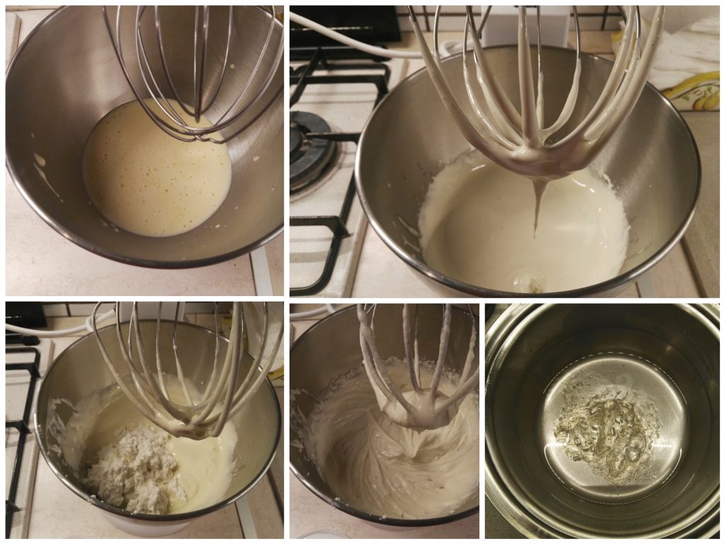 Cuando tengáis una textura ligera y espumosa, añadid, siempre con la batidora en marcha, el mascarpone poco a poco y después la ricotta; calentad 30 g de agua en un cazo y disolved las láminas de gelatina, luego verted en hilo sobre la crema.