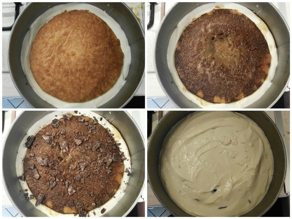 Forrad la base de un molde desmontable de 26 cm con papel de horno, volcad encima las galletas trituradas, compactad y alisad lo mejor posible; procurad que la base tenga el mismo espesor en todo el contorno. Distribuid un poco de chocolate negro encima (yo usé restos de un huevo de Pascua) y meted en la nevera a enfriar.