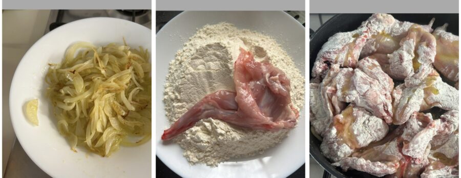 Retira la cebolla a un plato, dejando el aceite en la olla. Pasa los trozos de conejo por la harina, colócalos en la misma olla donde has dejado pochar la cebolla y dora con el mismo aceite, hasta que estén dorados por ambos lados.