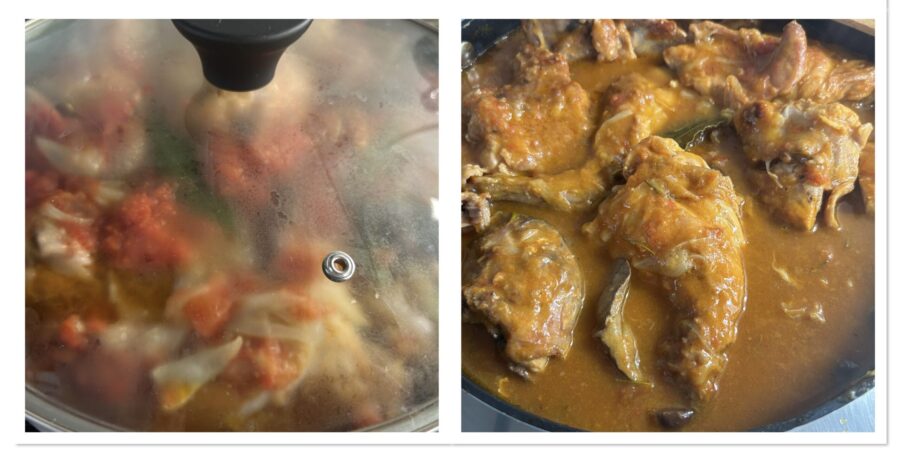 Pon la tapa en la olla y cocina durante 90 minutos, añadiendo agua si hace falta y removiendo de vez en cuando. Cuando la salsa se haya reducido, el conejo estará listo; déjalo reposar unos diez minutos y sirve caliente.